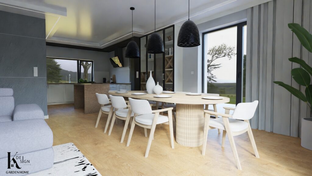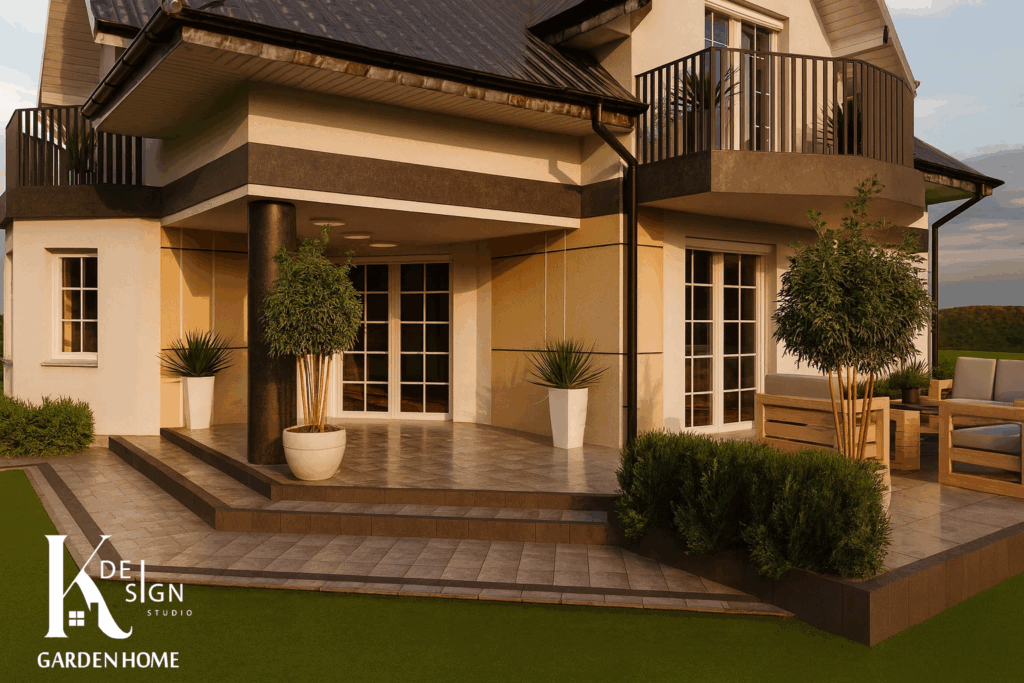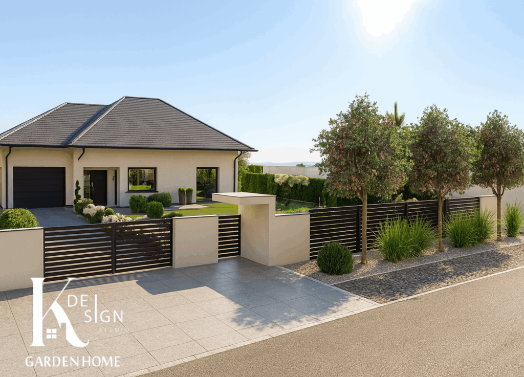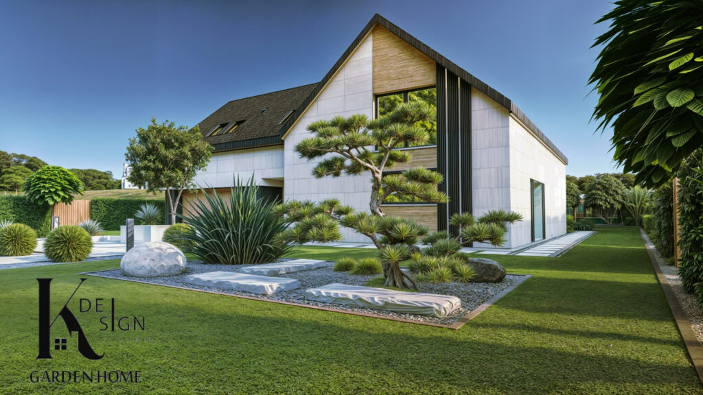 Chcąc uzyskać charakter eleganckiej, nowoczesnej willi zastosowano tynki i betony o jasnych odcieniach beżu, które przełamano pionowymi detalami sztukaterii i liniowego oświetlenia. Stworzyło to luksusowy kontrast, widoczny szczególnie po zmroku. Elewacja bardzo dobrze współgra z zielenią. Zaproponowane formowane kule, drzewka oliwne, yuki, palmy w donicach oraz element wodotrysku podkreślają reprezentacyjny i lekko śródziemnomorski charakter budynku. […]