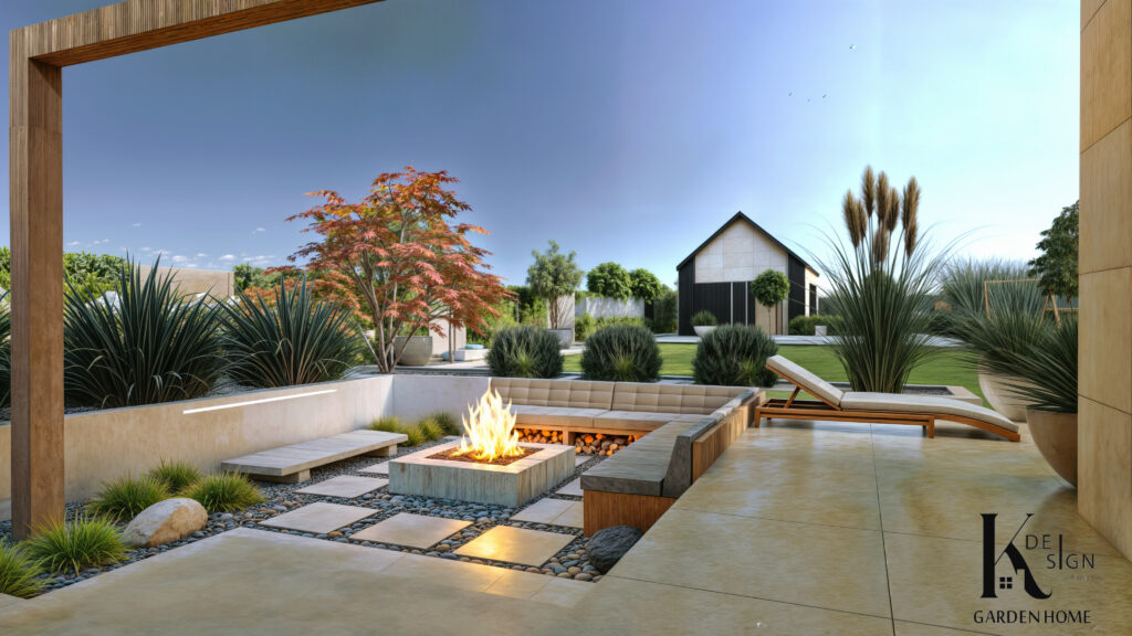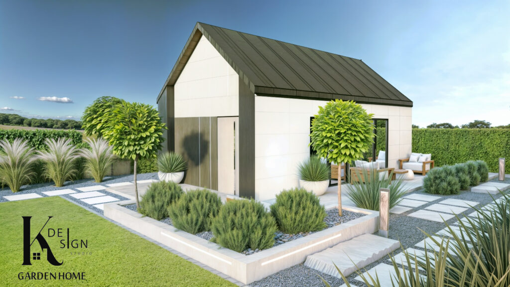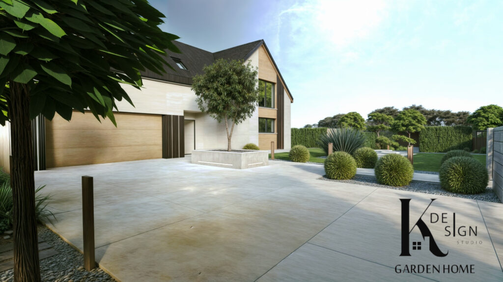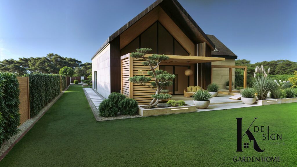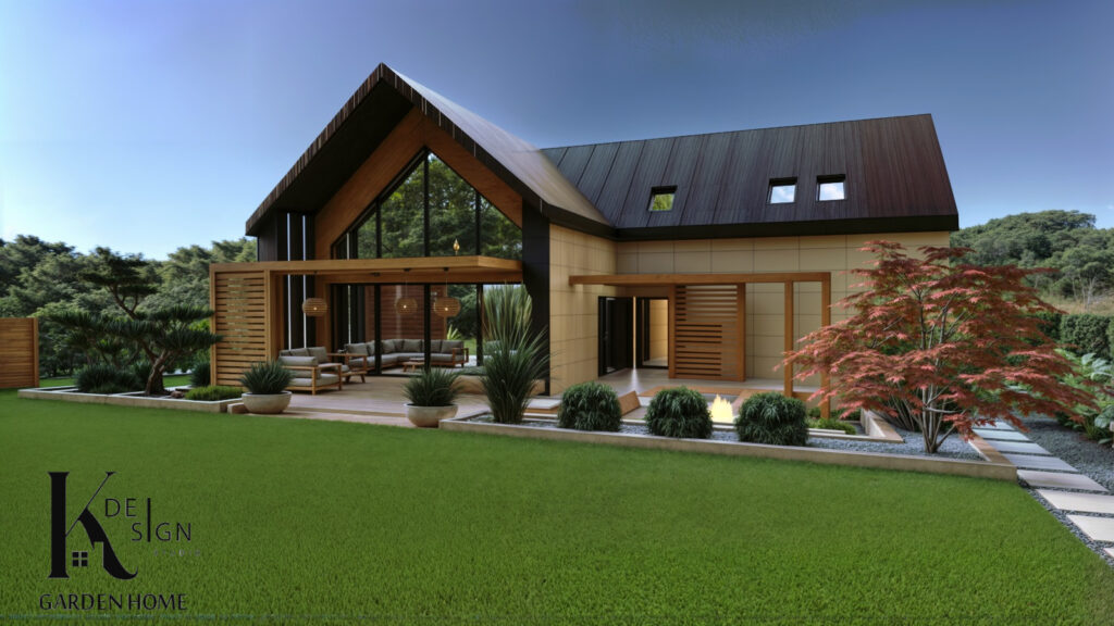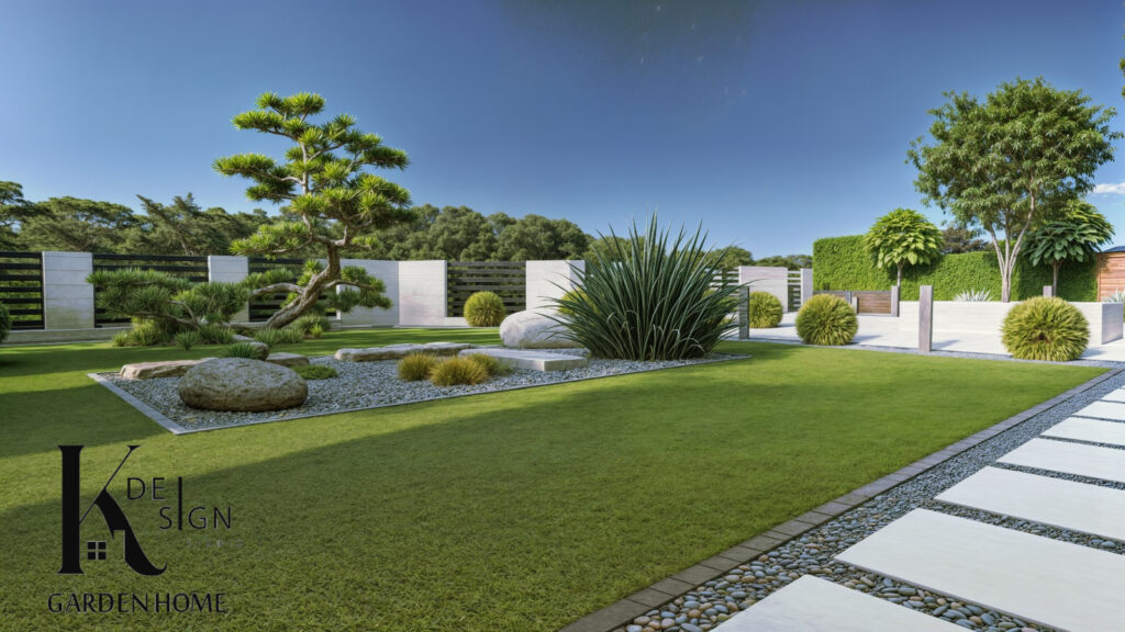 Wszechobecna prostota, elegancja oraz pełna harmonia stanowią podwaliny ogrodów japońskich. Ścieżki żwirowe mają odzwierciedlać wodę, pomiędzy nimi usytuowane płyty oraz asymetrycznie umieszczone wielkogabarytowe kamienie niczym wyspy- cechy charakterystyczne dla suchych ogrodów zwanych Karesansui. Pomiędzy nimi roślinność zielona, niekwitnąca, jak drzewa i krzewy o podobnym pokroju i kolorze, uzupełnione trawami rosnącymi w donicach betonowych stałych wokół tarasu, mniejszych donicach na tarasie oraz bezpośrednio w ogrodowych aranżacjach. Kolor zieleni przełamaliśmy czerwienią trzmieliny oraz grujecznikiem japońskim, roślinami które będą cieszyć nasze oczy przez cały rok, zmieniając się adekwatnie do pór roku. Nie mogło zabraknąć oczywiście drzewek formowanych Bonsai umieszczonych w reprezentacyjnych miejscach.