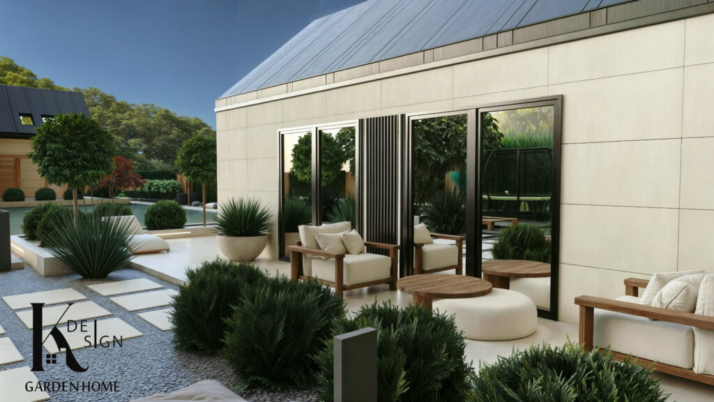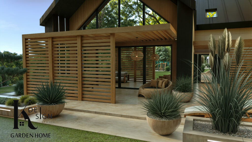 Dopełniającym akcentem jest pergola w drewnopodobnej kolorystyce z przesuwnymi skrzydłami, która uzupełniona o drewniane i ratanowe meble wypoczynkowe w jasnych, piaskowych odcieniach, lampiony oraz niewielkie kamienne dekoracje wprowadzi w nastrój do medytacji i relaksu.